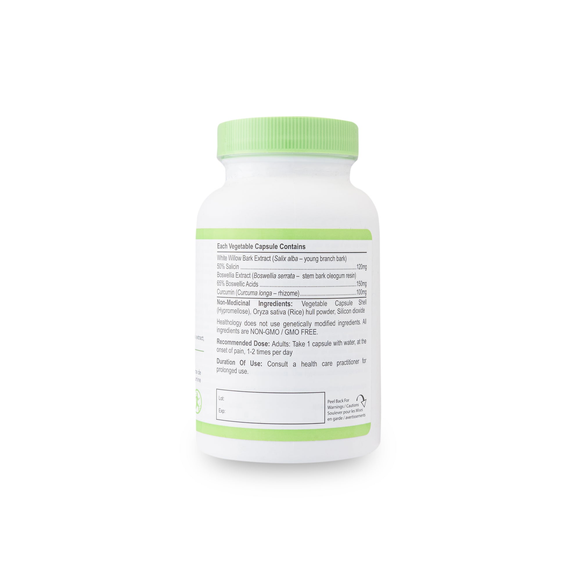 Ingredients: Each Capsule Contains: White Willow Bark Extract (Salix alba – young branch bark) 50% Salicin 120mg, Boswellia Extract (Boswellia serrata – stem bark oleogum resin) 65% Boswellic Acids 150mg, Curcumin (Curcuma longa – rhizome) 100mg; Non-Medicinal Ingredients: Vegetable Capsule Shell (Hypromellose), Oryza sativa (Rice) hull powder, Silicon dioxide