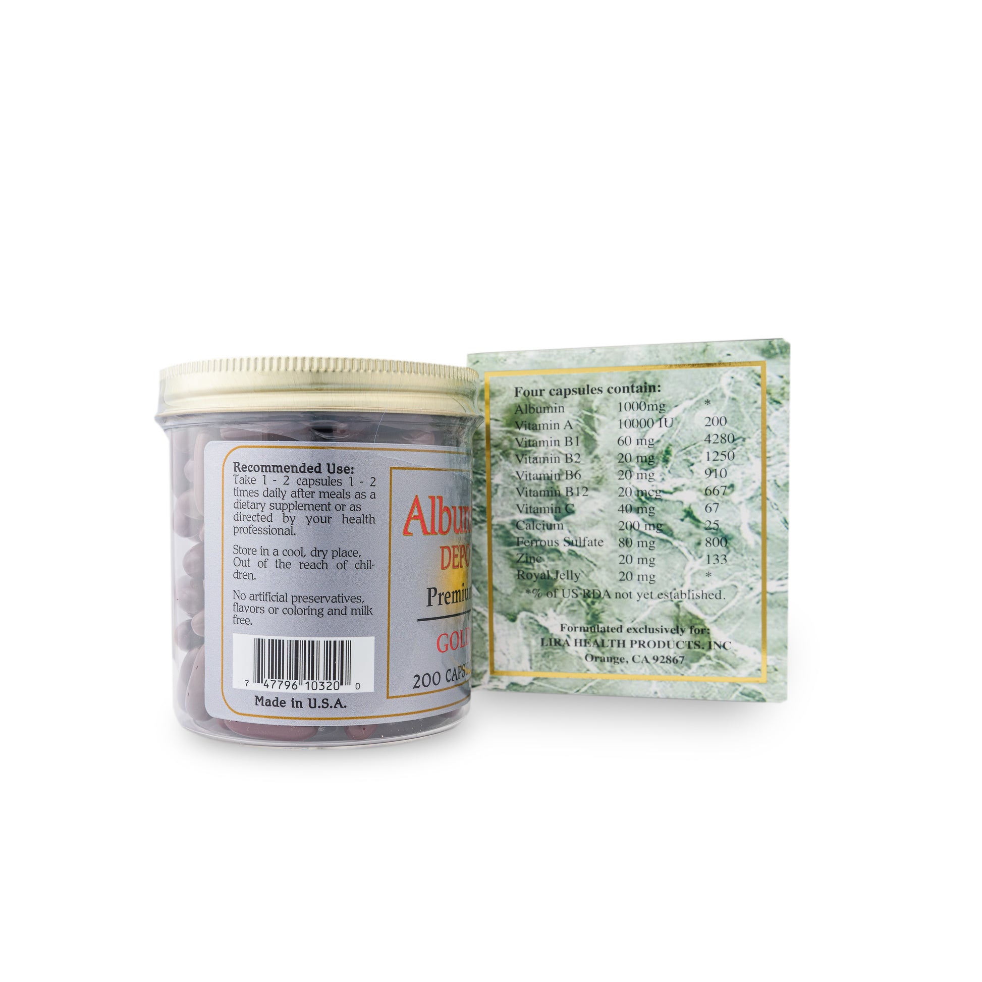 Ingredients: Four capsules contain: Albumin 1000mg *, Vitamin A 10000 IU 200% RDA, Vitamin B1 60 mg 4280% of RDA; Vitamin B2 20 mg 1250% of RDA; Vitamin B6 20 mg 910% of RDA; Vitamin B12 20 mcg 667% of RDA; Vitamin C 40 mg 67% of RDA; Calcium 200 mg 25% of RDA; Ferrous Sulfate 80 mg 800% of RDA; Zinc 20 mg 133% of RDA; Royal Jelly 20 mg *; * % of US RDA not yet established.