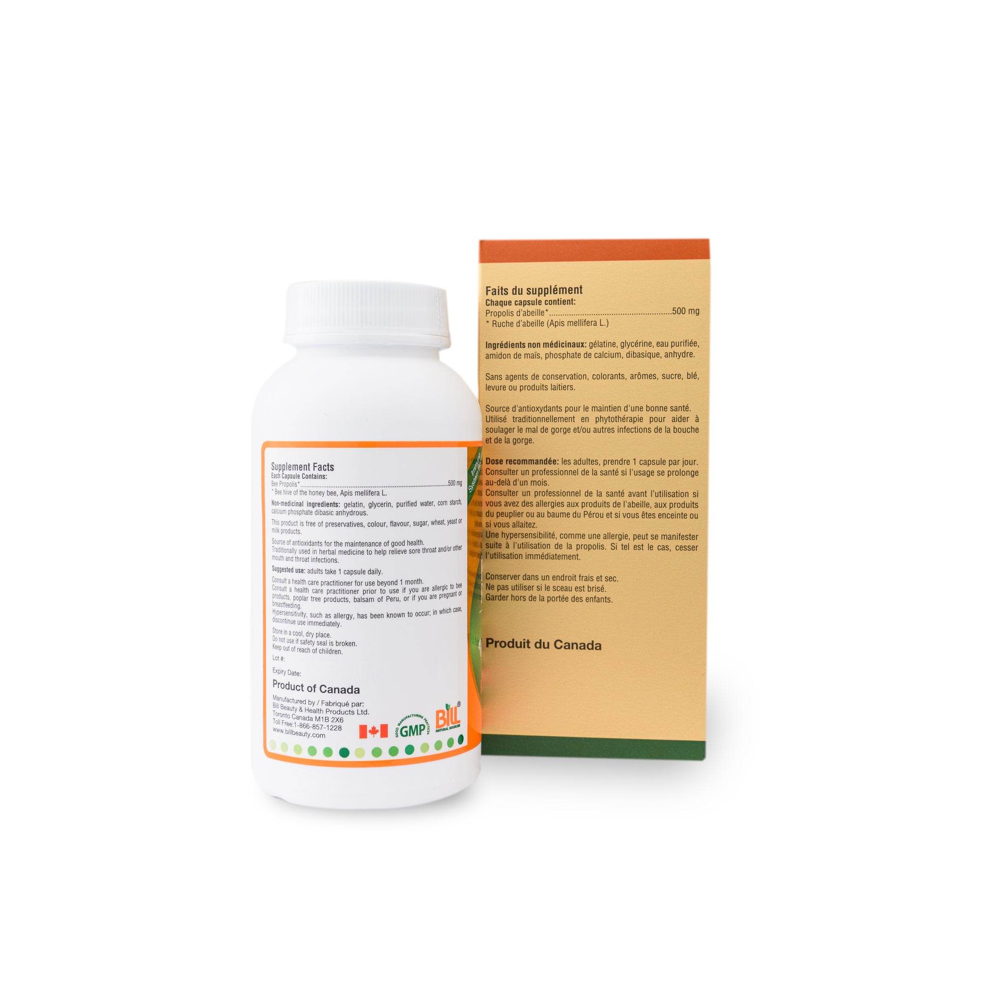 Ingredients: Each capsule contains: Bee Propolis 500 mg; Non-medicinal ingredients: gelatin, microcrystalline cellulose, dicalcium phosphate, magnesium stearate.