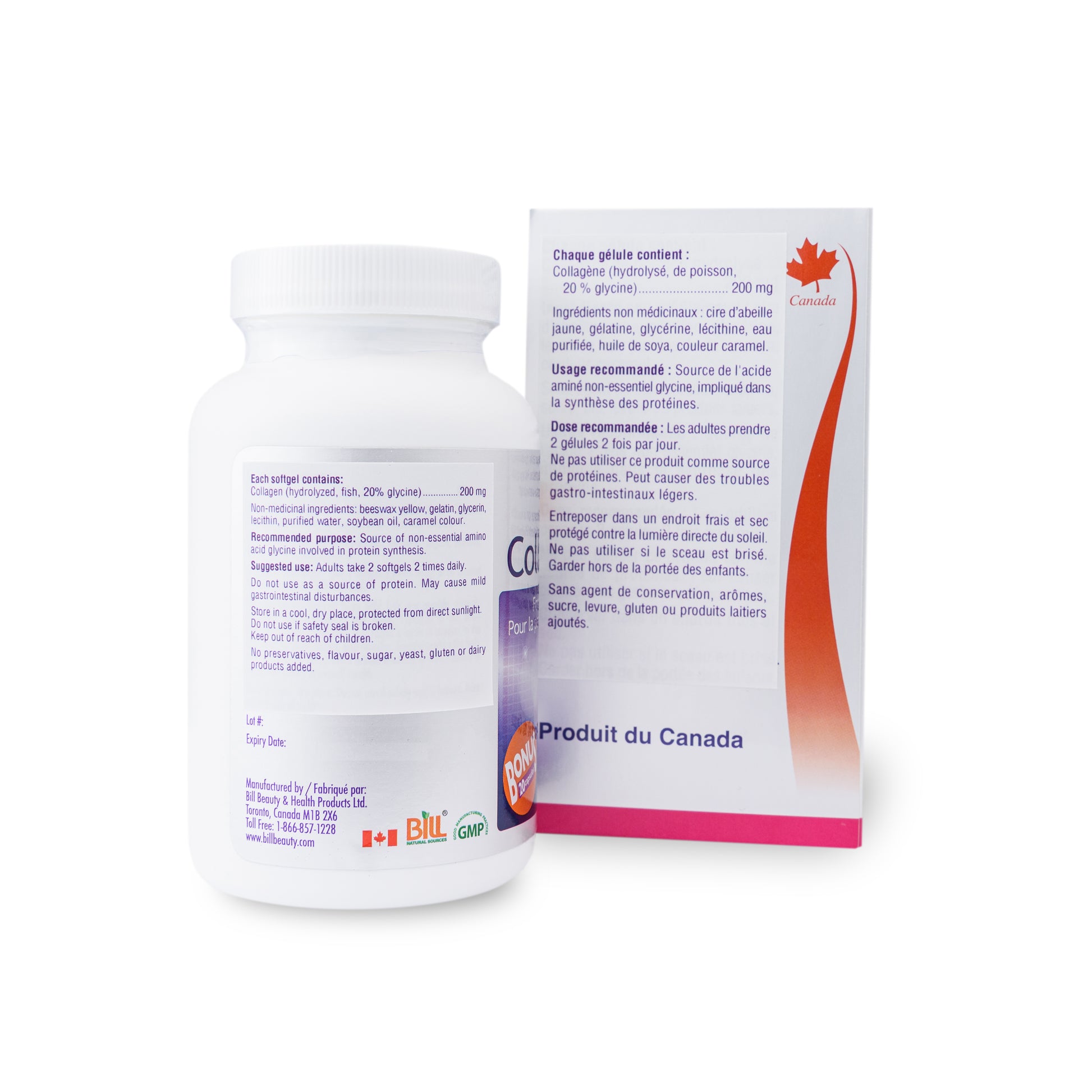 Ingredients: Each softgel contains: Collagen (hydrolyzed, fish, 20% glycine) 200 mg; Non-medicinal ingredients: beeswax yellow, gelatin, glycerin, lecithin, purified water, soybean oil, caramel colour.