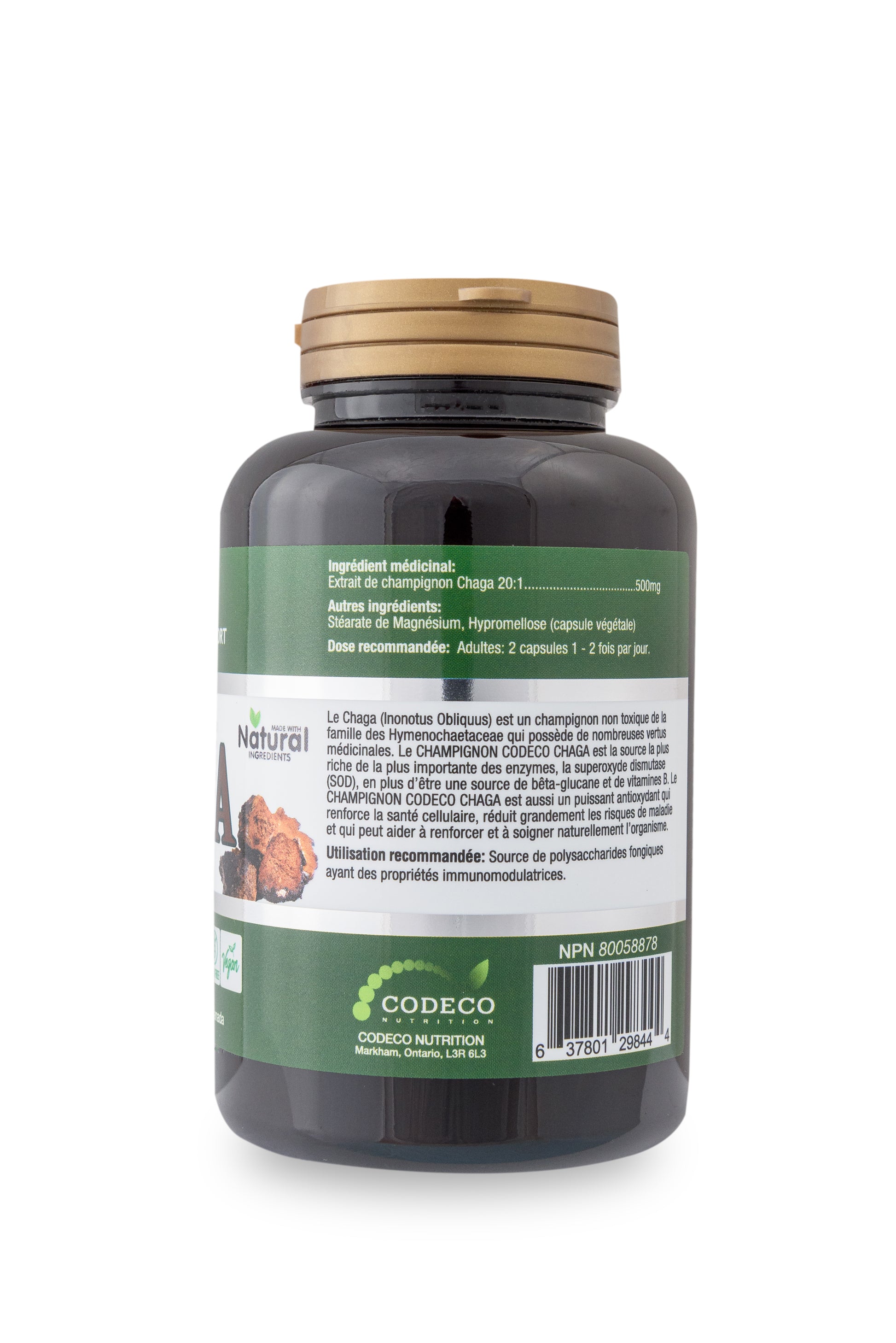 Ingredients: Chaga Mushroom Extract 20:1 500 mg; Non-medicinal ingredients: Magnesium Stearate, Hypromellose (vegetable capsule)