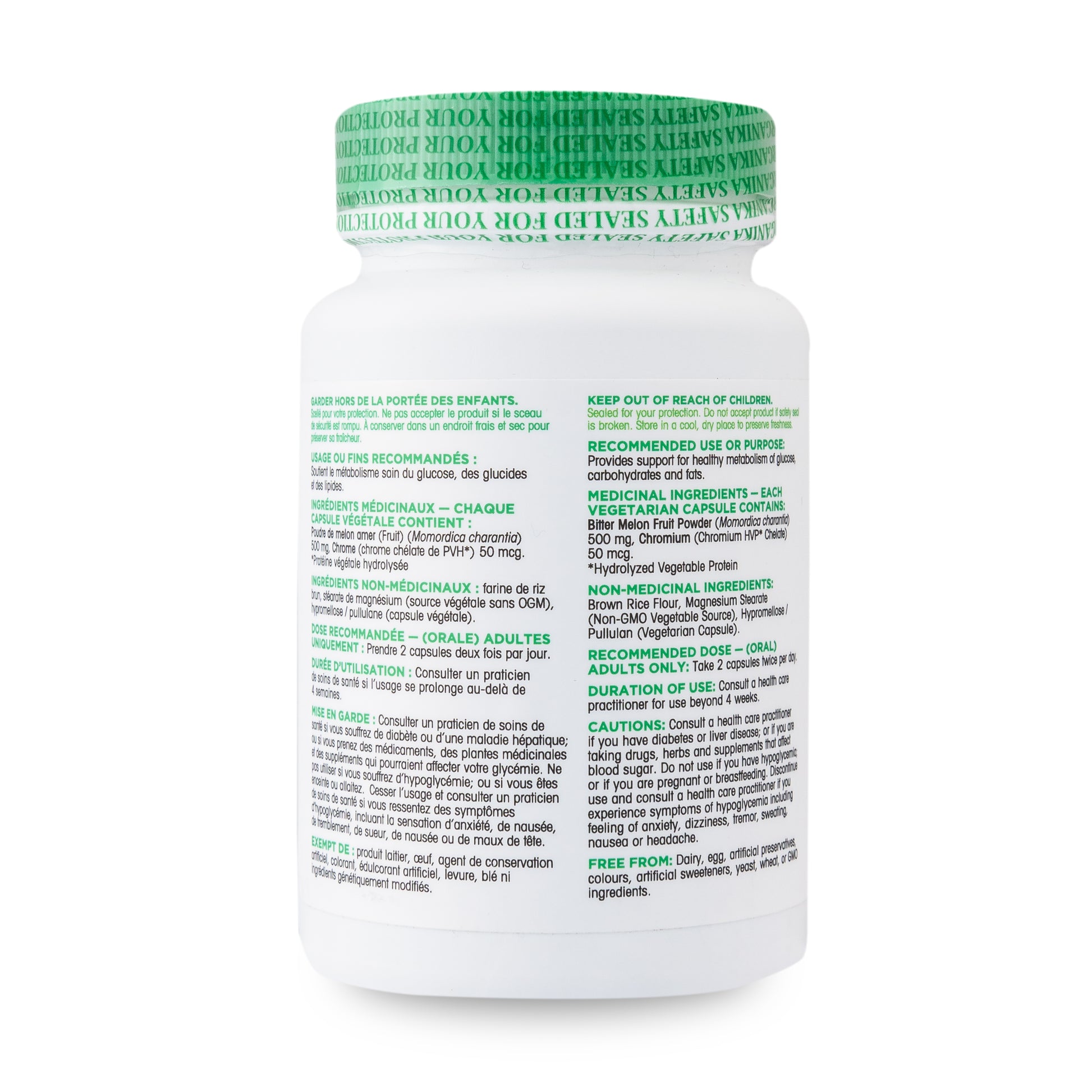 Ingredients: EACH VEGETARIAN CAPSULE CONTAINS: Bitter Melon Fruit Powder (Momordica charantia) 500 mg, Chromium (Chromium Hydrolyzed Vegetable Protein Chelate) 50 mcg; NON-MEDICINAL INGREDIENTS: Brown Rice Flour, Magnesium Stearate (Non-GMO Vegetable Source), Hypromellose / Pullulan (Vegetarian Capsule)