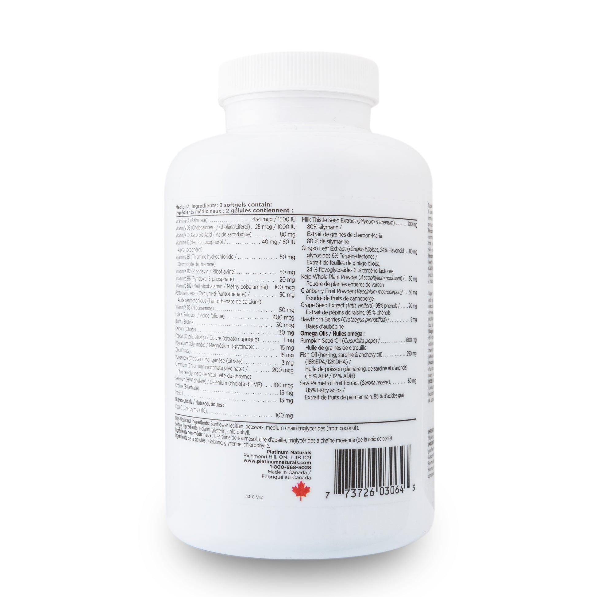 Ingredients: 2 softgels contain: Vitamin A (Palmitate) 454 mcg / 1500 IU, Vitamin D3 (Cholecalciferol) 25 mcg / 1000 IU, Vitamin C (Ascorbic Acid) 80 mg, Vitamin E (d-alpha tocopherol) 40 mg / 60 IU, Vitamin B1 (Thiamine hydrochloride) 50 mg, Vitamin B2 (Riboflavin) 50 mg, Vitamin B6 (Pyridoxine 5-phosphate) 20 mg, Vitamin B12 (Methylcobalamin) 100 mcg, Pantothenic Acid (Calcium-d-Pantothenate) 50 mg, Vitamin B3 (Niacinamide) 50 mg, Folate (Folic acid) 400 mcg, Biotin 30 mcg, Calcium (Citrate) 30 mg, Copper (Cupric citrate) 1 mg, Magnesium (Glycinate) 15 mg, Zinc (Citrate) 10 mg, Manganese (Citrate) 3 mg, Chromium (Chromium nicotinate glycinate) 200 mcg, Selenium (HVP chelate) 100 mcg, Choline (Bitartrate) 15 mg, Inositol 15 mg; Nutraceuticals: CoQ10 (Coenzyme Q10) 100 mg, Milk Thistle Seed Extract (Silybum marianum), 80% silymarin 100 mg, Gingko Leaf Extract (Gingko biloba), 24% Flavonoid, glycosides 6% Terpene lactones 80 mg, Kelp Whole Plant Powder (Ascophyllum nodosum) 50 mg, Cranberry Fruit Powder (Vaccinium macrocarpon) 50 mg, Grape Seed Extract (Vitis vinifera), 95% phenols 20 mg, Hawthorn Berries (Crataegus pinnatifida) 5 mg; Omega Oils: Pumpkin Seed Oil (Cucurbita pepo) 600 mg, Fish Oil (herring, sardine & anchovy oil) (18% EPA / 12% DHA) 250 mg, Saw Palmetto Fruit Extract (Serona repens) 85% Fatty acids 50 mg; Non-Medicinal Ingredients: Sunflower lecithin, beeswax, medium chain triglycerides (from coconut); Capsule Ingredients: Gelatin, glycerin, chlorophyll.