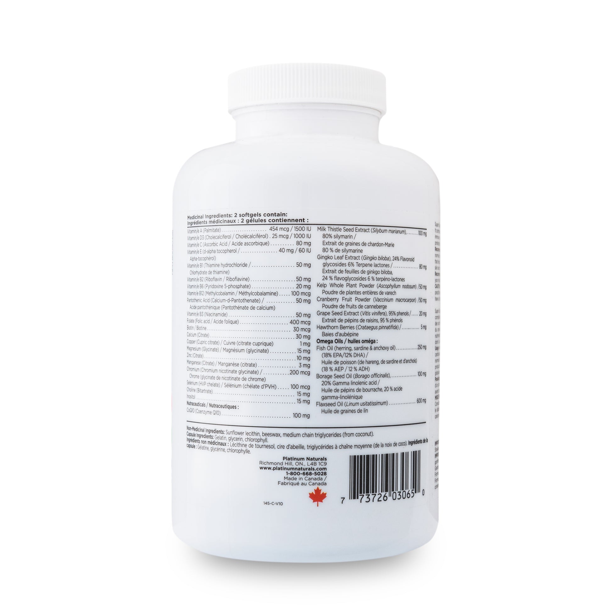 Ingredients: 2 softgels contain: Vitamin A (Palmitate) 454 mcg / 1500 IU, Vitamin D3 (Cholecalciferol) 25 mcg / 1000 IU, Vitamin C (Ascorbic Acid) 80 mg, Vitamin E (d-alpha tocopherol) 40 mg / 60 IU, Vitamin B1 (Thiamine hydrochloride) 50 mg, Vitamin B2 (Riboflavin) 50 mg, Vitamin B6 (Pyridoxine 5-phosphate) 20 mg, Vitamin B12 (Methylcobalamin) 100 mcg, Pantothenic Acid (Calcium-d-Pantothenate) 50 mg, Vitamin B3 (Niacinamide) 50 mg, Folate (Folic acid) 400 mcg, Biotin 30 mcg, Calcium (Citrate) 30 mg, Copper (Cupric citrate) 1 mg, Magnesium (Glycinate) 15 mg, Zinc (Citrate) 10 mg, Manganese (Citrate) 3 mg, Chromium (Chromium nicotinate glycinate) 200 mcg, Selenium (HVP chelate) 100 mcg, Choline (Bitartrate) 15 mg, Inositol 15 mg; Nutraceuticals: CoQ10 (Coenzyme Q10) 100 mg, Milk Thistle Seed Extract (Silybum marianum), 80% silymarin 100 mg, Gingko Leaf Extract (Gingko biloba), 24% Flavonoid, glycosides 6% Terpene lactones 80 mg, Kelp Whole Plant Powder (Ascophyllum nodosum) 50 mg, Cranberry Fruit Powder (Vaccinium macrocarpon) 50 mg, Grape Seed Extract (Vitis vinifera), 95% phenols 20 mg, Hawthorn Berries (Crataegus pinnatifida) 5 mg; Omega Oils: Fish Oil (herring, sardine & anchovy oil) (18% EPA / 12% DHA) 250 mg, Borage Seed Oil (Dorago officinalis) 20% Gamma linolenic acid 100 mg, Flaxseed Oil (Linum usitatissimum) 600 mg; Non-Medicinal Ingredients: Sunflower lecithin, beeswax, medium chain triglycerides (from coconut); Capsule Ingredients: Gelatin, glycerin, chlorophyll.